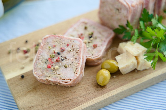 パウンド型にベーコンを敷き、③を詰めて上にローリエをのせる。